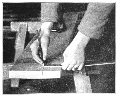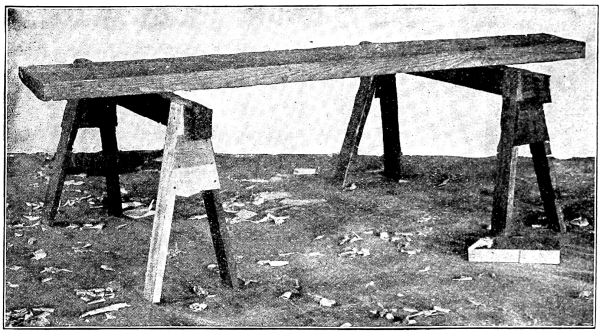Care should be taken to protect the top of the bench from injury; it should never be marked by the chisel or cut by the saw. If chiseling has to be done on the bench, place the work on the bench hook or on a board, and in sawing use a bench hook such as is shown in Fig. 2, that has a side lip that will protect the bench top.