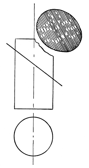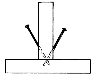 In all cases where ripping is done, the thrust of a saw should be on an angle of about 45 degrees to the material being cut, as shown in Fig. 4. [Pg 12] This makes a shearing cut, an advantage that can be quickly demonstrated with an ordinary pocket knife, cutting any piece of soft wood.