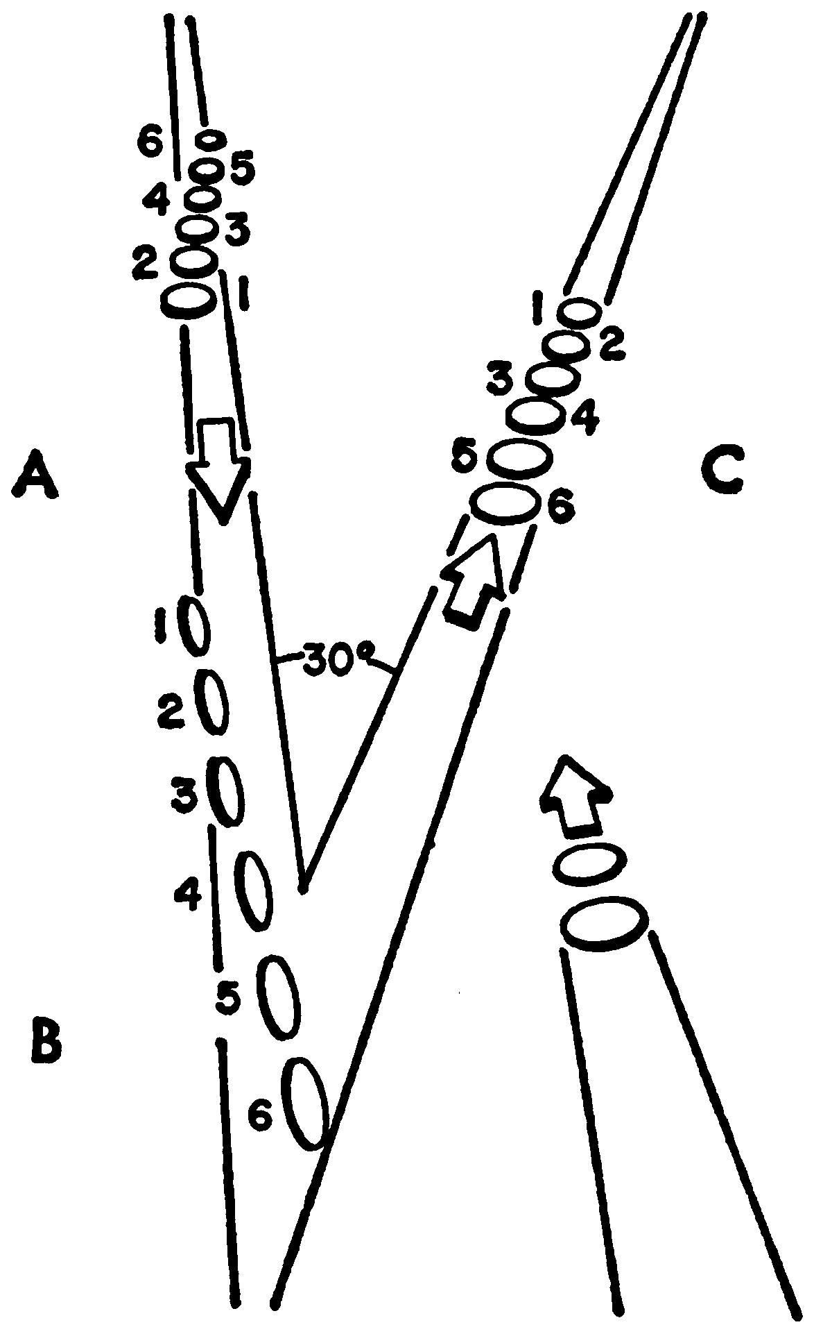 According to Air Force records[I-2], on the morning of December 6, 1952, a B-29 bomber was over the Gulf of Mexico returning from a training mission. At 5:25 A.M. the student radar operator, using an uncalibrated set, observed four bright blips (radar jargon for bright spots on a radarscope; such a spot indicates the presence of an object reflecting the radar pulses, but does not reveal the nature or shape of the object). The blips were apparently returns from objects about twenty miles away, in no specific group, which rapidly moved off the scope. Similar groups of fast-moving blips appeared at intervals during a period of about five minutes, and appeared also on two auxiliary radarscopes. After the first set was calibrated, the blips reappeared; none was observed after 5:35 A.M. From the radar data estimates of size and distance were made; calculations based on these estimates indicated a probable speed of 5000 to 9000 miles an hour. During the ten-minute period two visual observations were made, lasting about three seconds, which bore no obvious relation to the radar observations: at the right of the plane one crewman saw a single blue-white streak going from front to rear under the wing, and another crewman saw two flashes of blue-white light.