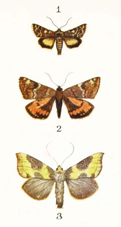 This is really a most lovely little moth. It is something like a very, very small “large yellow underwing.” But instead of having the front wings plain light or dark brown, with hardly any markings at all, it has them bright red-brown with pure white spots and wavy lines, while the hind-wings are of the brightest possible yellow, with a broad edging of glossy black.