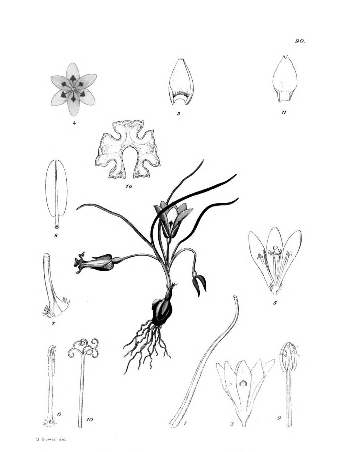 Plate 111.—Fig. 1, plant much reduced; 2, median longitudinal section of flower; 3, perianth segments; 4, anther; 5, style; 6, cross-section of leaf about the middle.