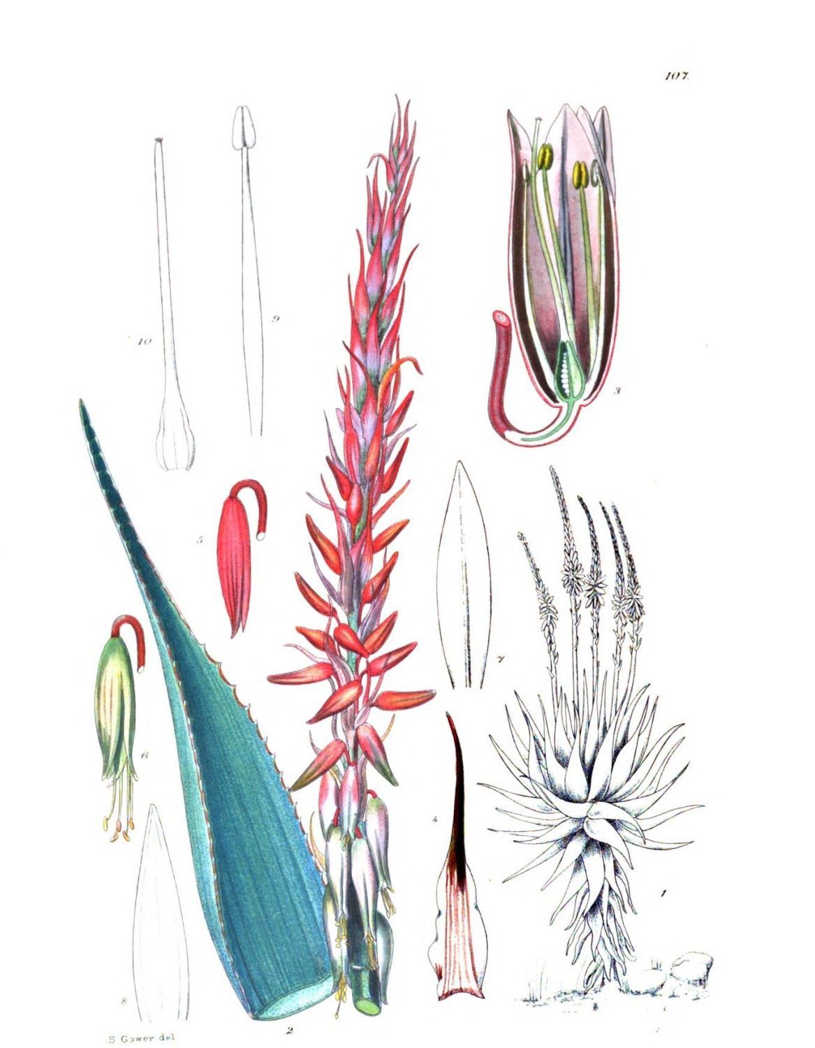 The Aloe here represented differs from any we have previously illustrated by having the leaves arranged in three ranks which may become spirally twisted. In the “Flora Capensis” this character is used to distinguish a sub-genus “Gonialoe” which contains only the species A. variegata. The species is one of the oldest and most common aloes in cultivation. A coloured illustration appeared in the Botanical Magazine (t. 513) in 1801, and it is recorded that a Mr. Fairchild had the species growing in England in 1720. For some reason the plant is not well represented in European herbaria, as even in 1897, when the genus was published in the “Flora Capensis,” the precise localities in which the species occurs in South Africa remained doubtful. The traveller and botanist, Carl Thunberg, collected the plant about 1772, and according to Mr. N. E. Brown it is represented in the Thunberg herbarium by “two leaves with the variegation on them well preserved, and a single flower.”