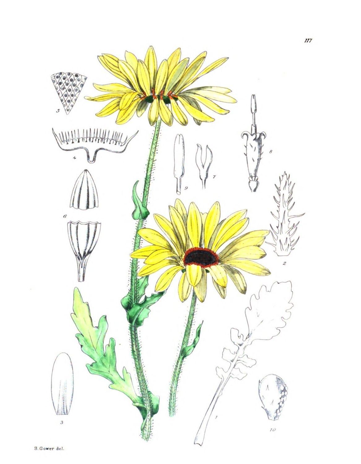 Plate 117.—Fig. 1, basal leaf reduced; 2, outer involucral bract; 3, inner involucral bract; 4, longitudinal section through receptacle; 5, surface view of part of receptacle; 6, ray-floret; 7, stigmas and portion of style of ray-floret; 8, disc-floret; 9, stigmas and portion of style of disc-floret; 10, fruit.