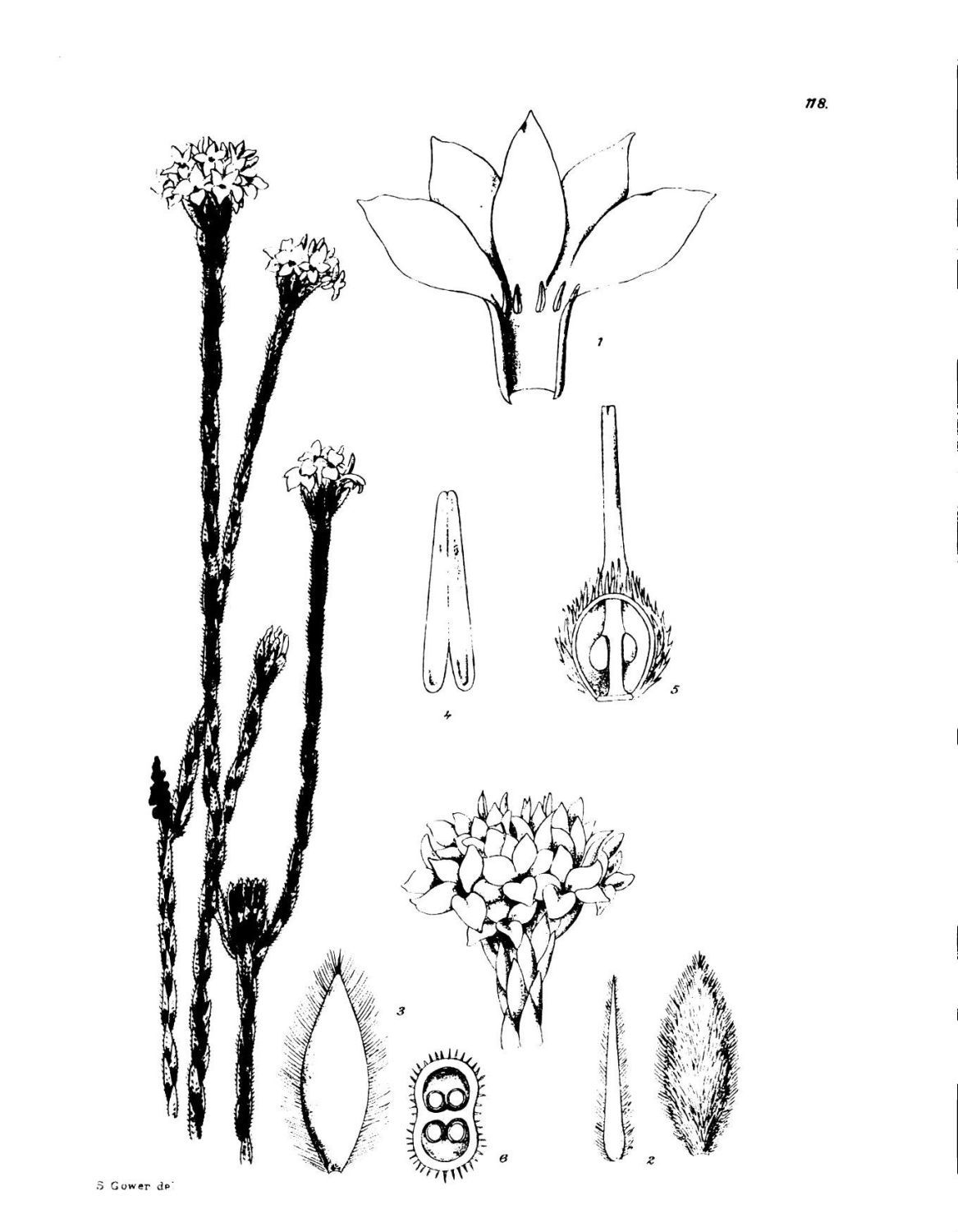 Description:—Stems simple or sometimes branched above, 40 to 50 cm. long, almost woolly, at length becoming glabrous. Leaves erect, adpressed to the branches and almost hiding them, 5 to 6 mm. long, 1·5 to 2 mm. broad, elliptic, obtuse, with a small black mucro, concave, pubescent without, glabrous within, long ciliate. Flower-heads terminal, 1·3 cm. in diameter, about 14-flowered. Bracteoles 5 mm. long, 1 mm. broad at the base, ovate-lanceolate, acuminate, with a long black mucro, membranous long pilose and ciliate. Sepals similar to the bracteoles. Corolla-tube, 3 mm. long, glabrous; lobes 6 mm. long, 3 to 3·5 mm. broad, obovate, shortly acuminate, obtuse. Anthers subsessile, 1·5 mm. long, linear, sagittate at the base. Ovary 1 mm. long, globose, pilose;{156} style 2 mm. long, terete, glabrous; stigma minutely bifid. (National Herb. Pretoria, No. 2600.)