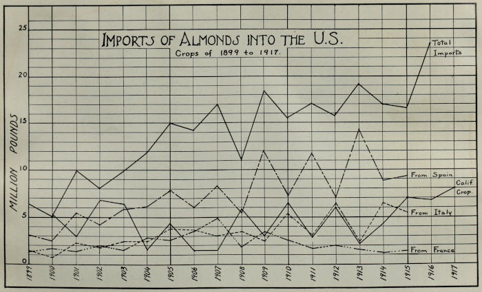 With the 1915 crop the production in California entered upon what appears to be a long prospective increase. The large acreage of almonds set out in the last four or five years is the result of greatly improved market conditions due to the successful work of the California[4] Almond Growers’ Exchange. The first of these new plantings are now coming into bearing, and each year for many years in the future will continue to see increased yields. Large acreages are still being planted so that the almond production in California bids fair to continue to grow.