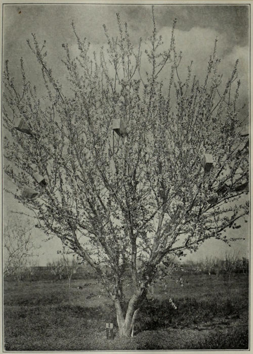 Fig. 2.—Seven-year-old Ne Plus Ultra almond in full bloom, at the University Farm, March, 1915, showing distribution of blossoms well down into center of tree. Paper bags cover blossoms pollenized by hand.