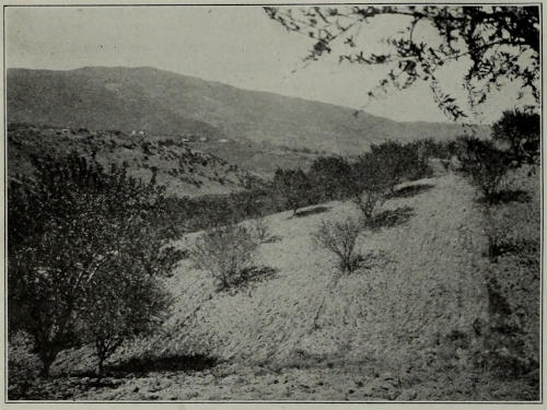 Fig. 3.—Typical hillside orchard of Jordan almonds near Los Gatos. Trees are variable in size, and some are missing. In the right foreground is a typical spot of missing trees resulting from Oak fungus infection.