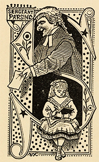 4 Serjeant Parsing (Brother Parsing, the Judge calls him) has a sharp nose, bright eyes, a little round wig with a tail to it, and an eye-glass. He is very quick and cunning in finding out who people are and what they mean, and making them tell “the truth, the whole truth, and nothing but the truth.” It is of no use to say “I don’t know” to Serjeant Parsing. He will question you, and question you, till somehow or other he makes you know, and finds out all about you. When I say he will question you, of course I mean he will question the Parts-of-Speech, for that is his business, and that is why Judge Grammar summoned him. For whenever there is a fuss in Grammar-land, Serjeant Parsing has to find out all about it, and Dr. Syntax has to say what is right or wrong, according to the law.