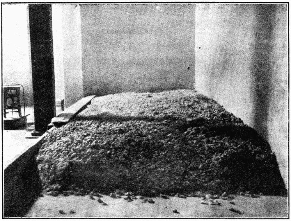 A second and serious source of infection is at the village depots. Before the figs arrive, there seem to be no specimens of the Ephestia in the buildings; but with their arrival the moth appears, and so favourable is the shelter from the heat and the wind, and so abundant is the supply of figs as sack after sack is emptied on to the floor, that soon the moth is more abundant in the depots than amongst the ‘serghi,’ and the wonder is that a single fig escapes infestation. Fortunately, the time spent in the depots is short, often only a night; were it much longer, the whole crop would suffer. On their way down to the coast again there is little or no risk of the moth, but arriving at Smyrna[Pg 122] we pick up the insect again in the ‘khans,’ where the figs are prepared for export, but in the larval form. Here, in August and September, little trace of the insect is seen, the larvae are then too small to emerge and pupate; but by October many full-grown[Pg 123] larvae may be found on the fig-heaps or crawling up the walls; a few pupate inside the figs, and these probably produce the few imagines found in the ‘khans,’ at the port of shipping. The unpleasantness of the larvae crawling all about the ship greatly detracts from the pleasure of a voyage on a vessel laden with Smyrna figs.
