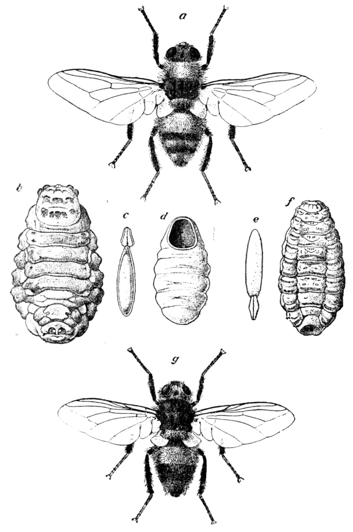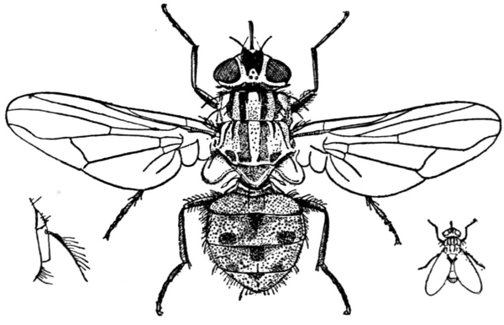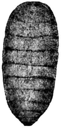 The issuing larva is almost transparent. It not only has no head, but the anterior end dwindles almost to a point. When fully[Pg 130] grown it attains a length of 11 mm., and the larval stage usually lasts from two to three weeks; but development may be retarded by adverse circumstances up to eleven or twelve weeks, and in such cases the full-grown larvae are often stunted in size. In these circumstances the pupae they produce are markedly smaller than those which have followed a more normal course of development. As is true of the egg and of the larva, the pupa resembles the pupa of the house-fly, being barrel-shaped and of a chestnut-brown colour; it is 5 to 5·5 mm. in length. The pupa stage lasts from nine to thirteen days, but this period is prolonged by cold.
