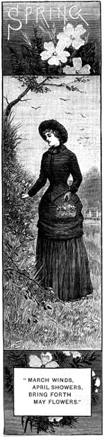 A Mother is thanked for the recipe she kindly gives for a description of embroidery, especially her own:—For the foundation, prepare as proposed for crazy work in our part for November, 1886. Get artificial flowers of velvet, old or new, the brighter the better, and of all varieties. Tack them on the sprays, large or small, or grouped; then use buttonhole-stitch to fasten down every flower in coarse crewel silk, of the respective colours required by the flowers, finishing round the larger flowers and leaves with gold tinsel cord, and using small yellow beads for flower seeds. The stems should be made in shaded greens with crewel-stitch, and the whole effect is very brilliant.