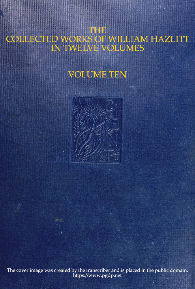 Hazlitt was a regular, though not a frequent contributor to The Edinburgh Review from 1814 until 1830, the year of his death. How he came to be introduced so early to Jeffrey’s notice is not known. Possibly the introduction came through Longman & Co., who had published Hazlitt’s Reply to Malthus (1807), and who had been the London publishers of the Review since its foundation in 1802. Hazlitt at any rate was proud of the connection, and had a high regard for Jeffrey, whom he called ‘the prince of critics and the king of men.’ See vol. II., Liber Amoris, p. 314 and note, and cf. also vol. IV. The Spirit of the Age, pp. 310–318. In The Atlas for June 21, 1829, there is a short article, ‘Mr. Jeffrey’s Resignation of the Editorship of The Edinburgh Review,’ which is not unlike Hazlitt, but cannot be confidently attributed to him.