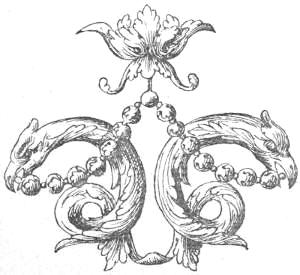 Mead was made from honey and water, fermented, and in many languages its name has a striking similarity. In Greek, honey is methu, in Sanskrit, madhu, and the drink made therefrom in Danish, is miod, in Anglo-Saxon, medu, in Welsh, medd, whence metheglyn—medd, mead, and llyn, liquor. In Beowulf we frequently find mention of the mead-horns, and we see it vividly portrayed in the heading of this chapter, which is taken from the Bayeux Tapestry. These horns were generally those of oxen, although some were made of ivory, and were probably used because fictile ware was so easily broken in those drinking bouts in which they so frequently indulged. Another reason was doubtless that they promoted conviviality, for, like the classical Rhyton, they could not be set down like a bowl, but must either be nursed, or their contents quaffed.