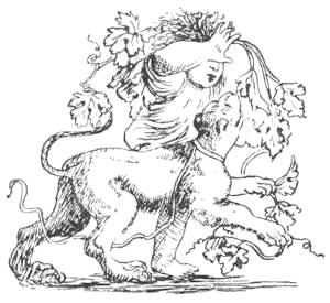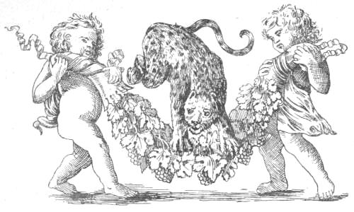 The process of wine-making was essentially the same among the Greeks and the Romans. The grapes were gathered, trodden, and submitted to the press. The juice which flowed from the grapes before any force was applied was known as πρόχυμα, and was reserved for the manufacture of a particular species of rich wine described by Pliny (H. N. xiv. II), to which the inhabitants of Mitylene gave the name of πρόδρομος. The Greeks recognised three colours in wines—black or red, white or straw-colour, and tawny brown (κιῤῥός, fulvus). When wine was carried, ἀσκοί, or bags of goat-skin, were used, pitched over to make them seam-tight. The cut above, from a bronze found[28] at Herculaneum (Mus. Borbon. iii. 28) exhibits a Silenus astride one of them.