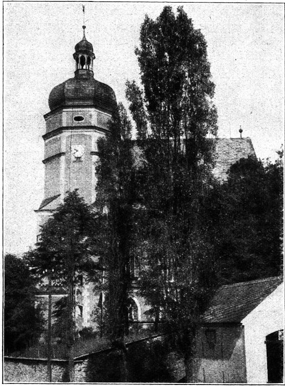 Doch draußen lacht die Sonne! Es hält uns nicht mehr im Zimmer. Wir steigen zur Kirche aufwärts, welche als achteckiger Zentralbau charaktervoll von der Höhe herniederschaut. Wir stehen dann am Grabe des Pfarrers Härtel, der ein rechter Pfarrer für seine Gemeinde war, ein treuer Berater für die Seele seiner Gemeinde, Helfer und Anreger auch in allen Dingen, die zur Blüte seiner Gemeinde in wirtschaftlicher, heimatkundlicher und kunstgewerblicher Hinsicht beitragen konnten, ein Freund der Heimat, festgewurzelt im Boden seiner geliebten Gemeinde.