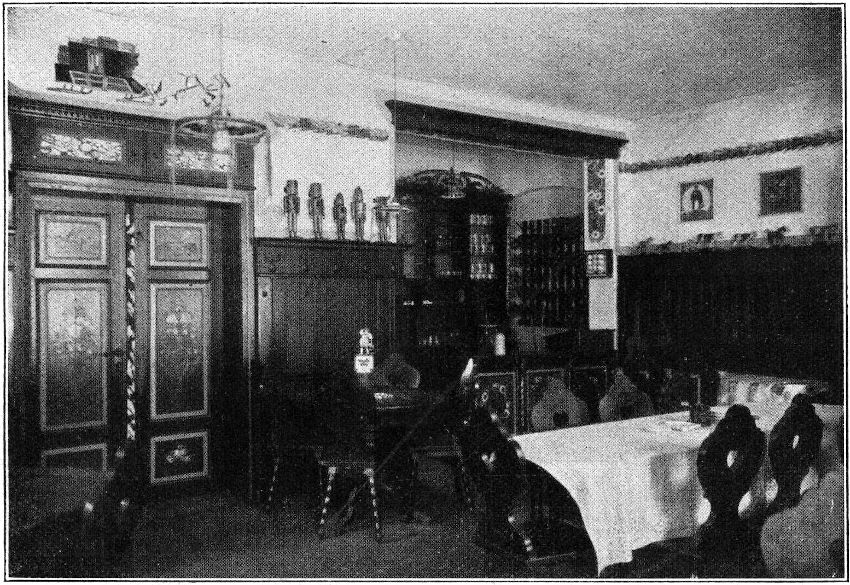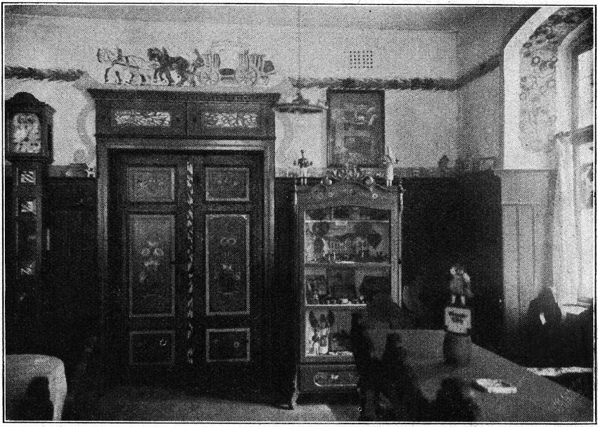 In einem Zimmer des Obergeschosses ist eine erzgebirgische Bauernstube eingerichtet mit allerlei echtem Geräte bis ins Kleinste liebevoll und mit großem Verständnis[120] ausgestattet. Dieser für die Volkskunde belangreiche Raum ist so recht ein Zeugnis für den Sammeleifer und die liebevolle Art, mit der die großen und die vielen kleinen, doch oft so wichtigen Dinge des täglichen Lebens und untergehender Sitten und Gebräuche erfaßt und bewahrt werden. Es ist zugleich auch ein Zeugnis für den Geist, der durch das Bunte Haus geht, der alles aus Liebe zur Sache mit großen Opfern geschaffen und nicht der Reklame und des bloßen Gewinnes wegen, obschon auch hier die alte Wahrheit sich wieder erweist, daß das Echte und Schöne und Gute seinen Lohn sich selbst bereitet.