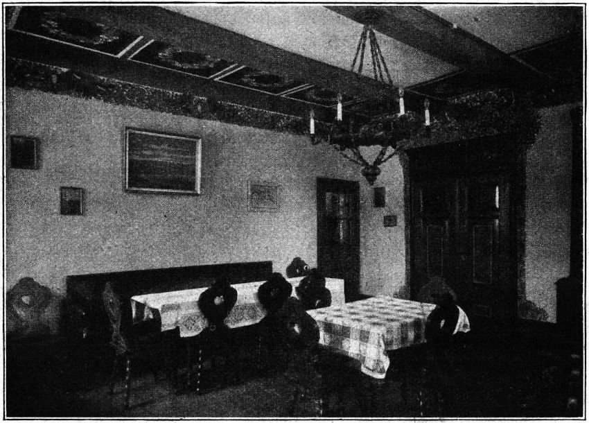 So geht es dir im ganzen Hause! Soll ich jeden Raum dir schildern? Nein, komm und sieh und freue dich, daß ein solches Werk in einem Gusse ganz aus dem Geiste der Volkskunst, der Heimatfreude und des Heimatschutzes heraus geschaffen ist. Schaust du in die Gastzimmer, so findest du keine Hotelschablone. Nein, Bett und Leuchter, Tür, Stuhl und Spiegel sind dem Geiste des Ganzen angepaßt. Kleine Originalgemälde schmücken die Wand, die du, wenn sie dir besonders gefallen, sogar für mäßigen Preis erwerben kannst. Manch launiger Vers grüßt dich. An der Kammer der Magd steht warnend der Vers: