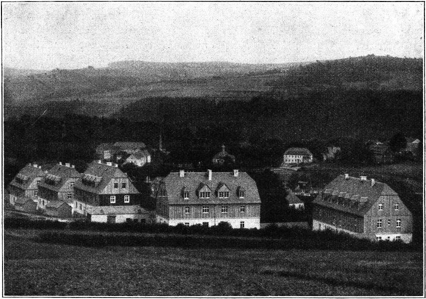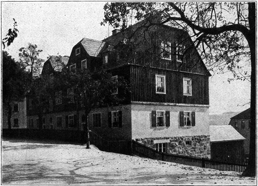 Am Gückelsberger Haus liegt nach Süden zu ein großer Hof mit abgegrenzten Holzplätzen von Schuppen eingefaßt. In der »Grünen Aue«, die sich an einen Wohnweg anschmiegt, sind die Bauwiche, die aus den baupolizeilichen Vorschriften entstehen, in ähnlicher Weise mit Schuppen zu Höfen eingerahmt und zu Holzstapelplätzen verwendet. Vor den Sonnenseiten der Häuser ziehen sich in langen[129] Reihen die Bleich- und Trockenplätze und die kleinen schmucken Gärtchen hin. Und aus den Fenstern der Schlafzimmer und der Wohnküchen kann der Blick weit hinausschweifen über die weiten Höhen und Täler, auf die massige blaue Augustusburg, in das herbe waldgrüne Zschopautal. Das ist Erholung für des Arbeiters Auge, Ruhe nach der Schicht zwischen den surrenden Spindeln und kreischenden Fleyern. Und auch nach außen haben diese Häuser ihr eigenes erzgebirgisches Gewand. Diese straffe, geschlossene und doch weiche Gliederung der Massen, die bodenständigen Bruchsteine des Sockelgeschosses, der freundliche Putzstreifen, die dunkle Brettverkleidung des Obergeschosses mit ihren leuchtend weißen Fensterteilungen und das blaue Schieferdach, hier und da ein freundlicher grüner Blumenkasten mit Geranien und Kresse! Ist das nicht die Farbenzusammenstellung, die jeden Wanderer erfreut, wenn er an den alten Häuschen der langen Gebirgsdörfer vorüberzieht?