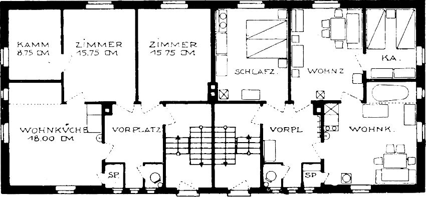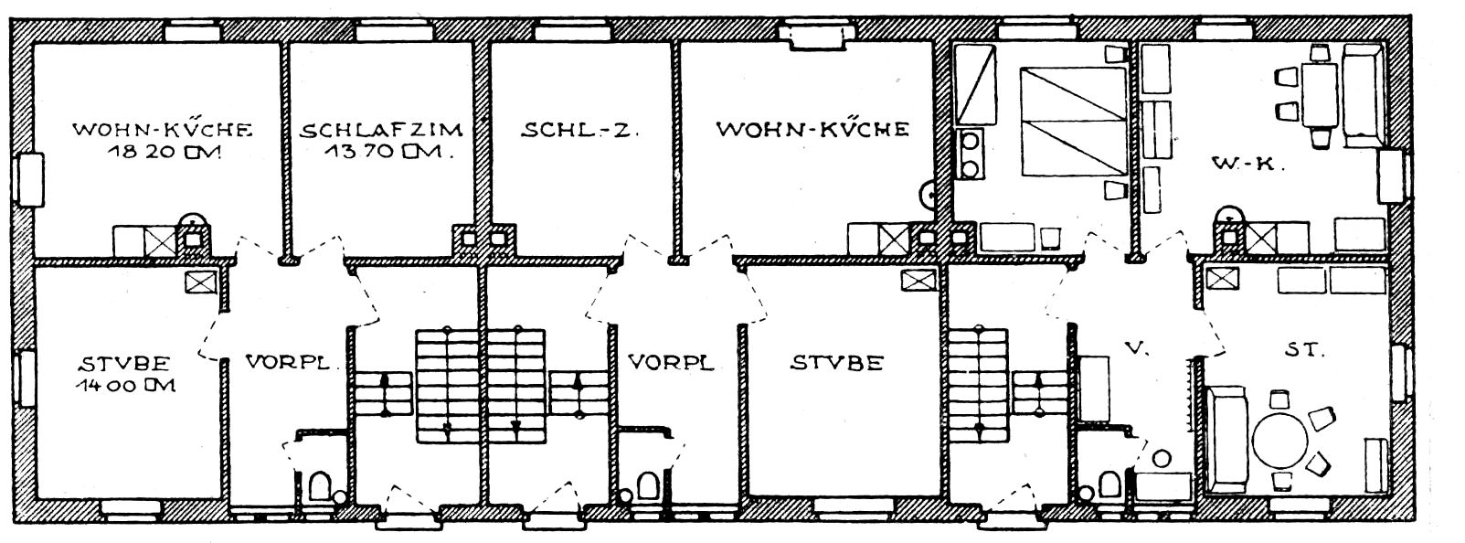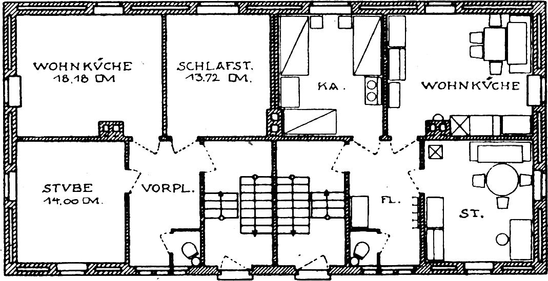 Auf all diese Bedürfnisse ihrer Arbeiter haben die Bauherrschaften im Verein mit ihrer Bauleitung, der Flöhaer Bezirkssiedelungsgesellschaft, sorgsam Bedacht genommen. Die Grundrißtypen fangen das Sonnenlicht auf, solange es sich einfangen läßt. Bei ihnen gibt es nicht mehr Straßen- und Hoffront, sondern nur noch Licht- und Schattenseite. Stets liegen Schlafraum und Wohnküche nach Süden. Immer liegt auch nur eine Wohnung an einer Treppe in einem Geschoß. Ein geräumiger heller Flur bietet Platz für Schränke und Kleiderablage, denn die staubigen Arbeitskleider und Schuhe gehören nicht in die Schlaf- und Wohnräume.[126] Ganz besondere Liebe ist der Wohnküche zuteil geworden. Immer hat sie zwei Fenster nach verschiedenen Himmelsrichtungen, so daß den ganzen Tag über die Sonne in ihr spielen kann. Der große Kachelherd fängt in seinem Turm die Wärme und gibt sie langsam wieder an den Raum ab. In die Fensterbrüstung ist die kleine Speisekammer als Schrank eingebaut. Mit Kellerraum ist jede Wohnung reichlich bedacht.