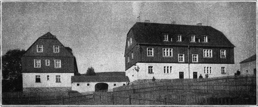 Dabei hat nüchterne wirtschaftliche Erwägung diese Formgebung maßgebend beeinflußt, sie ist durchaus nicht etwa der Laune der Architekten entsprungen. Für das Fachwerk stand Heeresholz preiswert zur Verfügung. Gebrannte Ziegel waren knapp und teuer, aber Lehmziegel, sogenannte Grünlinge, standen noch in großer Menge in den heimischen Ziegeleien. Lehmbauversuche wollten weder die Bauherren noch die Bezirkssiedelungsgesellschaft anstellen und so wurde eben auf die altbewährte erzgebirgische Bauweise zurückgegriffen. Auch beim inneren Ausbau ist trotz der Abkehr von modischen Zeitströmungen und trotz sparsamster Verwendung der Mittel das Heim freundlich und liebenswert gestaltet worden. Zum Schluß mag noch anerkennend erwähnt sein, daß beide Firmen die Bauten, welche fast drei Millionen Mark kosteten, ohne irgendwelchen Zuschuß ganz aus eigener Kraft erbaut haben. Diese Selbsthilfe der Heimat in ihrer Not ist auch ein Stück Heimatschutz, still und geräuschlos, aber desto wert- und wirkungsvoller.