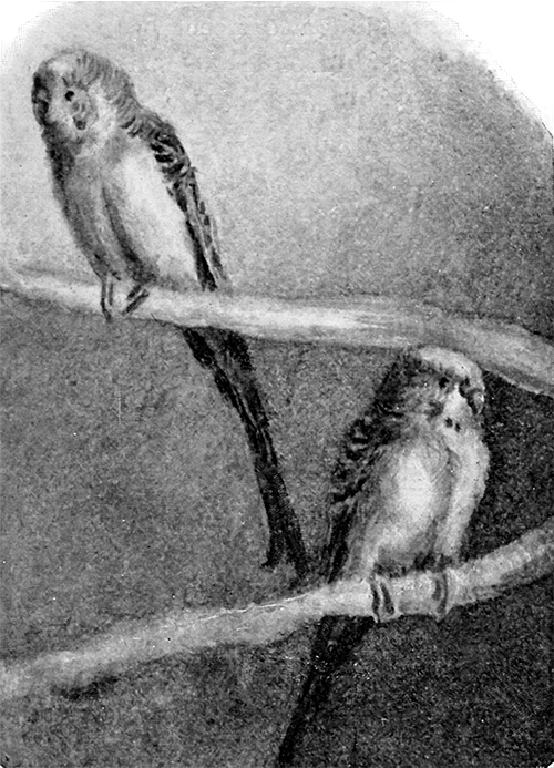 For a long time Gypsy had no society but mine and the canaries. He did not care for canaries, and he was mostly in a passion with me. But after some time a pair of goldfinches was given to us, much attached to each other and otherwise uninteresting. One day I put Gypsy in their cage to see what would happen. In three minutes a complete change had been worked in that happy home. Gypsy was sitting with the92 little lady on her perch, whispering sweet nothings into her ear, while her disconsolate spouse sat by himself on the perch below, meditating pistols for two and coffee for one.