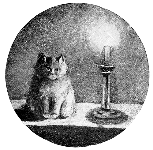 When Persis walked out of her travelling-basket, I thought that I had never seen so pretty a kitten. She was about as long as she was high, and as broad as she was long; her coat was of grey—or as this particular shade is called blue—and white, soft, long hair; and she had olive-yellow eyes. She would not have much to say to me just then; but when I came into the room, where she had been shut up in the evening, and saw the little, upright figure sitting on the table beside a lighted candle, which my nurse had set there in case she should feel lonely and unhappy in the dark, after a moment’s contemplation—for Persis is shortsighted—she jumped down and rushed to meet me.