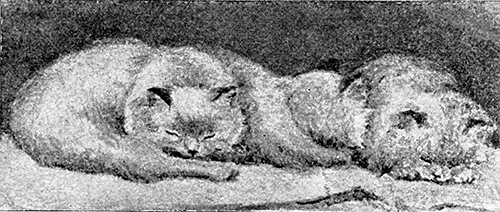 But I am wandering from the point of my story. Before Persis’ kittens came she had some friends, but no rivals. She treated her friends in a rather severe manner at first. One of them was a fox-terrier, called Don. The first time she was introduced to him she nearly jumped out of her skin with swearing and spitting. When he went out of the room, she went round to all the places where he had been and spit at them afresh. She has a fine scent; if new people have been in the room she always goes round and smells the places where they have been. She smells every new dress I have. The meek Don, who could kill a strange cat as soon as look at it, submitted wonderfully to her whims; and when she flew at him, beside herself with passion because he was enjoying the coffee sugar at the bottom of a cup merely picked the cup up in his teeth and trotted off. But she soon got accustomed to him. And then, distressed at his appearance, tried to lick the black spots off his back; used stealthily to wash the inside of his ears, ready always to rain a shower of blows on his nose with the tips of her paws if he so much as turned round. Then she17 began to worship in a manner not common to cats; with the sincerest flattery, she used to lie at his feet in the same position that he was lying in; if, for instance, he was lying with his legs stretched straight out below him, she would lie with her back touching the tips of his toes and her legs stretched out in the same way—an unnatural position for a cat.