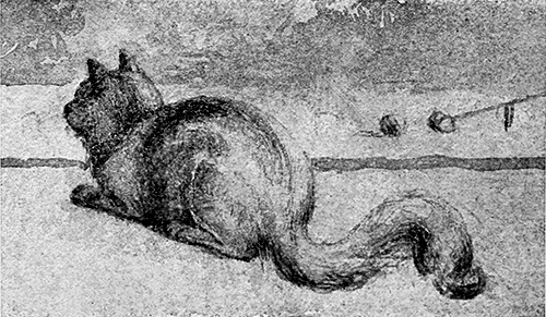 This was how I found it out. Pasht had been for many days very eager to go into the garden. One morning we were playing croquet on the lawn, and I paid no attention to the kitten, until suddenly I looked up to see her lying on the path, her long thick hair fluffed out, her sweet mouse-coloured cat’s visage resting on the edge of the grass, her little chin rubbing against it, and her long squirrel tail lazily sweeping and thumping the gravel.