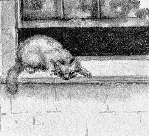 Finally we compromised: she was allowed to sleep half-way up, embracing my arm if she liked. But I was rather glad when this habit was broken, because she began not to leave me enough room. One of my brothers thought he would try her in his room one night, but he had broken rest; for first she made defiant runs at him from the end of the bed, then in the middle of the night he was waked up by a pitiful howling, of which he took no notice. Two hours later he was waked again by louder howling, and then discovered that the cat had got out of one of his windows, walked on a narrow moulding round to a shut window, and did not dare to go back again. She was so overjoyed at being taken in that16 she fell into the bath. After that she came on his bed.