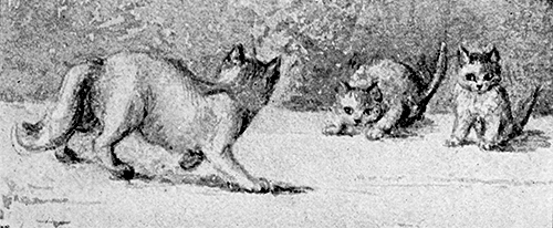 Then began the game. Rector rolled the kittens43 over and played with them gently, until all three became a little excited; then, if Rector got carried away, and bit or scratched his infant till it squeaked, out bounced Jenny from the bushes to deal him a handsome box on the ear; and, having thus admonished her husband to take better care of the children, she retreated again to the shelter of the yew-trees.