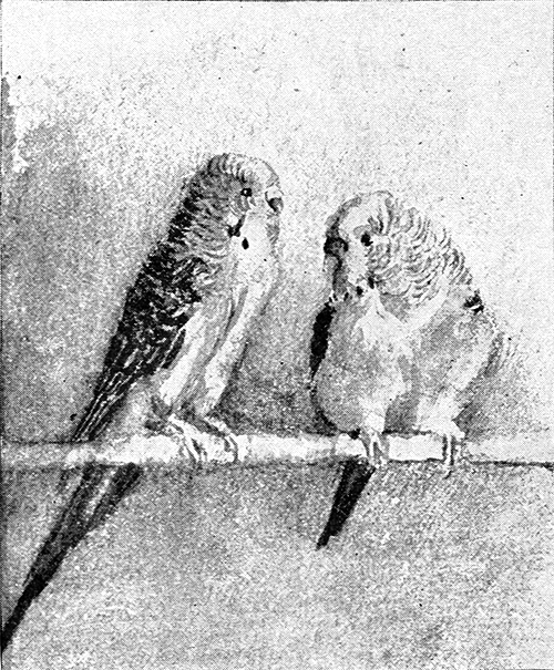 For a long time Gypsy had no society but mine and the canaries. He did not care for canaries, and he was mostly in a passion with me. But after some time a pair of goldfinches was given to us, much attached to each other and otherwise uninteresting. One day I put Gypsy in their cage to see what would happen. In three minutes a complete change had been worked in that happy home. Gypsy was sitting with the92 little lady on her perch, whispering sweet nothings into her ear, while her disconsolate spouse sat by himself on the perch below, meditating pistols for two and coffee for one.