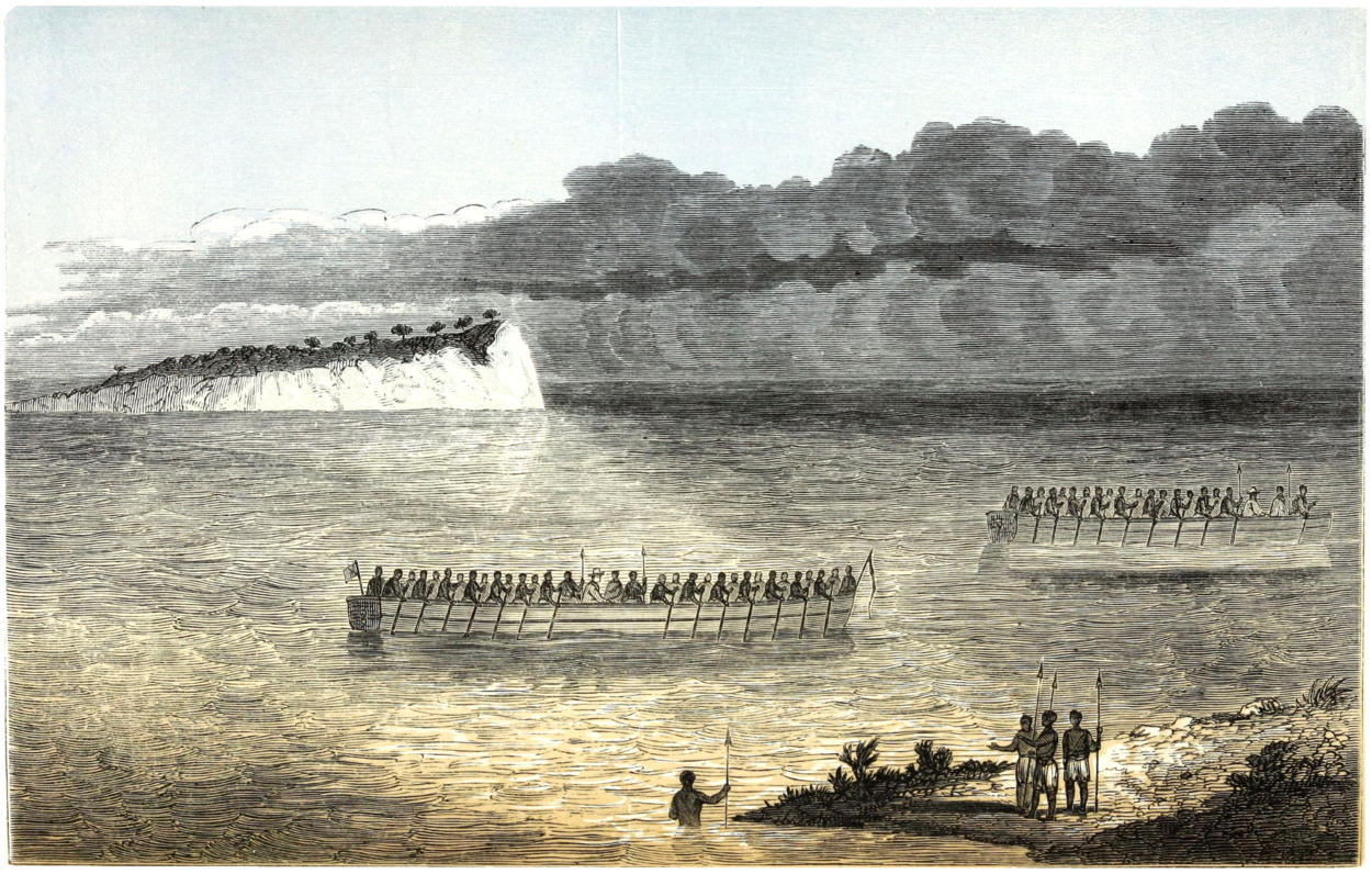 Arrived at Ukaranga I was disappointed to find there a few miserable grass-huts—used as a temporary shelter by caravans passing to and from the islets fringing the opposite coast—that clustered round a single Tembe, then occupied by its proprietor, Hamid bin Sulayyam, an Arab trader. Presently the motive of the rascally Fundi, in misleading the caravan, which, by the advice of Snay bin Amir, I had directed to march upon the Kawele district in Ujiji, leaked out. The roadstead of Ukaranga is separated from part of Kawele by the line of the Ruche River, which empties itself into a deep hollow bay, whose chord, extending from N.W. to S.E., is five or six miles in length. The strip of shelving plain between the trough-like hills and the lake is raised but a few feet above water-level. Converted by the passage of a hundred drains from the highlands, into a sheet of sloppy and slippery mire, breast deep in select places, it supports with difficulty a few hundred inhabitants: drenched with violent rain-storms and clammy dews, it is rife in fevers, and it is feared by travellers on account of its hippopotami and crocodiles. In the driest [45] season the land-road is barely practicable; during and after the wet monsoon the lake affords the only means of passage, and the port of Ukaranga contains not a single native canoe. The Fundi, therefore, wisely determined that I should spend beads for rations and lodgings amongst his companions, and be heavily mulcted for a boat by them. Moreover, he instantly sent word to Mnya Mtaza, the principal headman of Ukaranga, who, as usual with the Lakist chiefs, lives in the hills at some distance from the water, to come instanter for his Honga or blackmail, as, no fresh fish being procurable, the Wazungu were about to depart. The latter manœuvre, however, was frustrated by my securing a conveyance for the morrow. It was an open solid-built Arab craft, capable of containing thirty to thirty-five men; it belonged to an absent merchant, Said bin Usman; it was in point of size the second on the Tanganyika, and being too large for paddling, its crew rowed instead of scooping up the water like the natives. The slaves, who had named four khete of coral beads as the price of a bit of sun-dried “baccalà,” and five as the hire of a foul hovel for one night, demanded four cloths—at least the price of the boat—for conveying the party to Kawele, a three hours’ trip. I gave them ten cloths and two coil-bracelets, or somewhat more than the market value of the whole equipage,—a fact which I effectually used as an argumentum ad verecundiam.