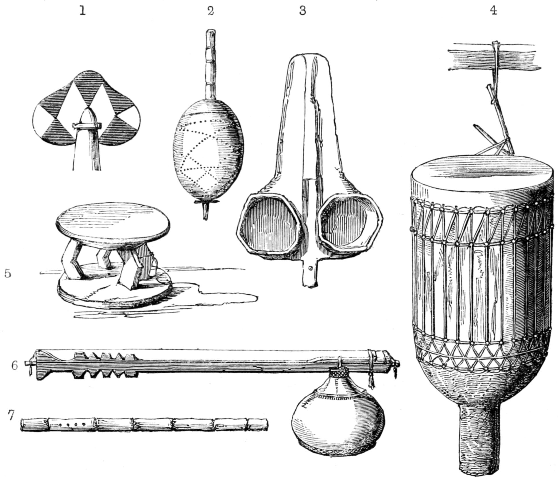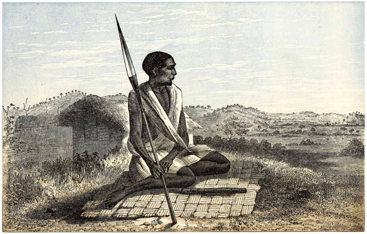 The aspect of the Wanyamwezi is alone sufficient to disprove the existence of very elevated lands in this part of the African interior. They are usually of a dark sepia-brown, rarely coloured like diluted Indian ink, as are the Wahiao and slave races to the south, with negroid features markedly less Semitic than the people of the eastern coast. The effluvium from their skins, especially after exercise or excitement, marks their connection with the negro. The hair curls crisply, but it grows to the length of four or five inches before it splits; it is usually twisted into many little ringlets or hanks; it hangs down like a fringe to the neck, and is combed off the forehead after the manner of the [21] ancient Egyptians and the modern Hottentots. The beard is thin and short, there are no whiskers, and the moustachio—when not plucked out—is scant and straggling. Most of the men and almost all the women remove the eyelashes, and pilar hair rarely appears to grow. The normal figure of the race is tall and stout, and the women are remarkable for the elongation of the mammary organs. Few have small waists, and the only lean men in the land are the youths, the sick, and the famished. This race is said to be long-lived, and it is not deficient in bodily strength and savage courage. The clan-mark is a double line of little cuts, like the marks of cupping, made by a friend with a knife or razor, along the temporal fossæ from the external edges of the eyebrows to the middle of the cheeks or to the lower jaws. Sometimes a third line, or a band of three small lines, is drawn down the forehead to the bridge of the nose. The men prefer a black, charcoal being the substance generally used, the women a blue colour, and the latter sometimes ornament their faces with little perpendicular scars below the eyes. They do not file the teeth into a saw-shape as seen amongst the southern races, but they generally form an inner triangular or wedge-shaped aperture by chipping away the internal corners of the two front incisors like the Damaras, and the women extract the lower central teeth. Both sexes enlarge the lobes of the ears. In many parts of the country skins are more commonly worn than cloth, except by the Sultans and the wealthier classes. The women wear the long tobe of the coast, tightly wrapped round either above or more commonly below the breast; the poorer classes veil the bosom with a square or softened skin; the remainder of the dress is a kilt or short petticoat of the same material extending from [22] waist to knee. Maidens never cover the breast, and children are rarely clothed; the infant, as usual in East Africa, is carried in a skin fastened by thongs behind the parent’s back. The favourite ornaments are beads, of which the red coral, the pink, and the “pigeon-eggs” made at Nuremberg are preferred. From the neck depend strings of beads with kiwangwa, disks of shell brought from the coast, and crescents of hippopotamus teeth country made, and when the beard is long it is strung with red and particoloured beads. Brass and copper bangles or massive rings are worn upon the wrists, the forearm bears the ponderous kitindi or coil bracelet, and the arm above the elbow is sometimes decorated with circlets of ivory or with a razor in an ivory étui; the middle is girt with a coil of wire twisted round a rope of hair or fibre, and the ankles are covered with small iron bells and the rings of thin brass, copper, or iron wire, called sambo. When travelling, a goat’s horn, used as a bugle, is secured over the right shoulder by a lanyard and allowed to hang by the left side: in the house many wear a smaller article of the same kind, hollowed inside and containing various articles intended as charms, and consecrated by the Mganga or medicine-man. The arms are slender assegais with the shoulders of the blade rounded off: they are delivered, as by the Somal, with the thumb and forefinger after a preliminary of vibratory motion, but the people want the force and the dexterity of the Kafirs. Some have large spears for thrusting, and men rarely leave the hut without their bows and arrows, the latter unpoisoned, but curiously and cruelly barbed. They make also the long double-edged knives called sime, and different complications of rungu or knob-kerries, some of them armed with an iron lance-head upon the wooden bulge. [23] Dwarf battle-axes are also seen, but not so frequently as amongst the western races on the Tanganyika Lake. The shield in Unyamwezi resembles that of Usagara; it is however rarely used.