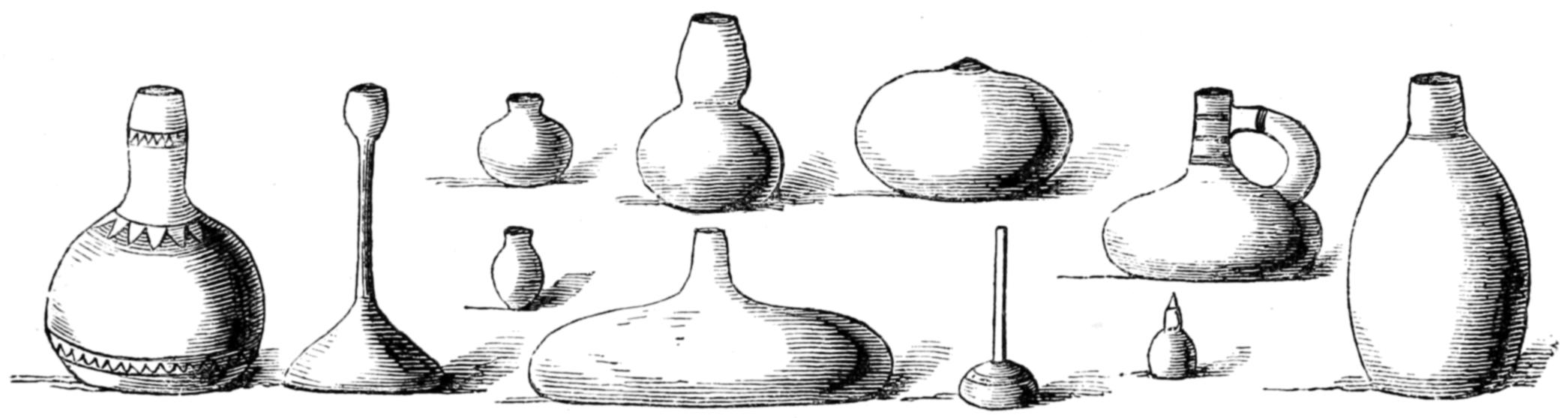 The habitations of the eastern Wanyamwezi are the Tembe, which in the west give way to the circular African hut; among the poorer sub-tribes the dwelling is a mere stack of straw. The best Tembe have large projecting eaves supported by uprights: cleanliness, however, can never be expected in them. Having no limestone, the people ornament the inner and outer walls with long lines of ovals formed by pressing the finger tips, after dipping them into ashes and water for whitewash, and into red clay or black mud for variety of colour. With this primitive material they sometimes attempt rude imitations of nature—human beings and serpents. In some parts the cross appears, but the people apparently ignore it as a symbol. Rude carving is also attempted upon the massive posts at the entrances of villages, but the figures, though to appearance idolatrous, are never worshipped. The household furniture of the Tembe differs little from that described in the villages generally. The large sloping Kitanda, or bedstead of peeled tree-branch, supported by forked [27] sticks, and provided with a bedding of mat and cowhide, occupies the greater part of the outer room. The triangle of clay cones forming the hearth are generally placed for light near the wall-side opposite the front door; and the rest of the supellex consists of large stationary bark cornbins, of gourds and bandboxes slung from the roof, earthen-pots of black clay, huge ladles, pipes, grass-mats, grinding-stones, and arms hung to a trimmed and branchy tree trunk planted upright in a corner. The rooms are divided by party walls, which, except when separating families, seldom reach to the ceiling. The fireplace acts as lamp by night, and the door is the only chimney.