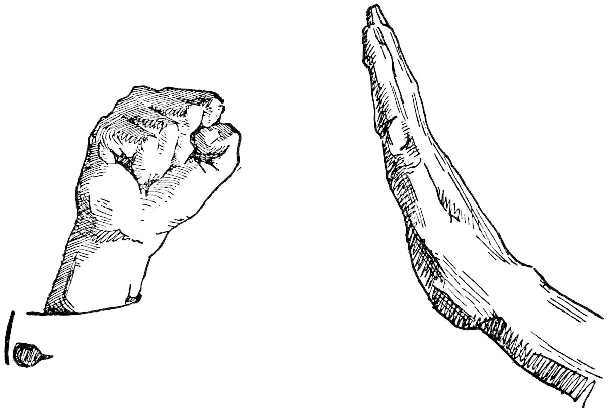 Hold your right hand before you, double up your fist tightly, thumb on the outside of the fingers. The hand turned with the palm side facing you. Open the hand briskly and with considerable effort, letting it turn around, so that the back of the hand is now turned toward you. Be sure to get this point and turn the hand around as you open the fingers. As you open the hand, be sure to keep the fingers stiff and bend them back from the wrist as far as possible. Repeat this exercise twenty times.