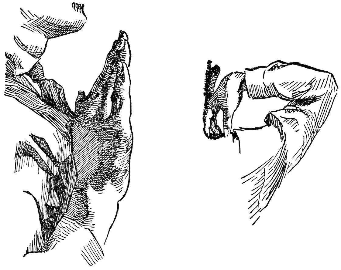 Bring the finger tips of the right hand together with the tip of the thumb, spreading the fingers at the middle knuckle and rounding the whole back of the hand. From this position snap the whole hand out flat, with the fingers spread wide apart. Do this forcibly. Quickly return to the original position and repeat the exercise twelve times.