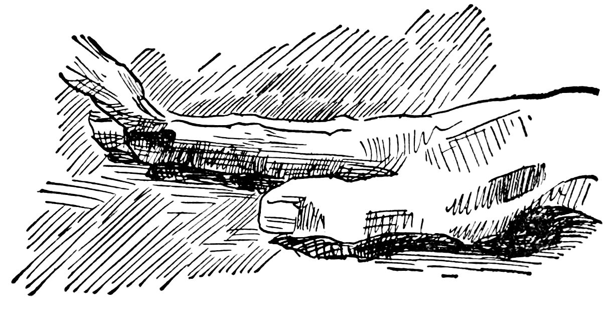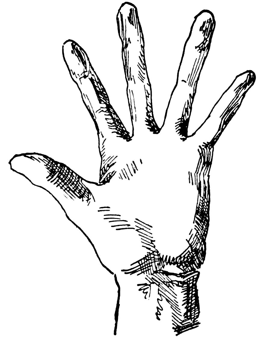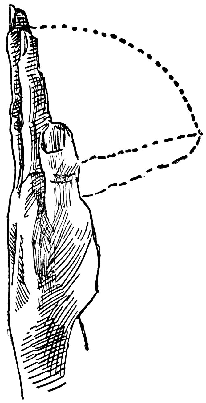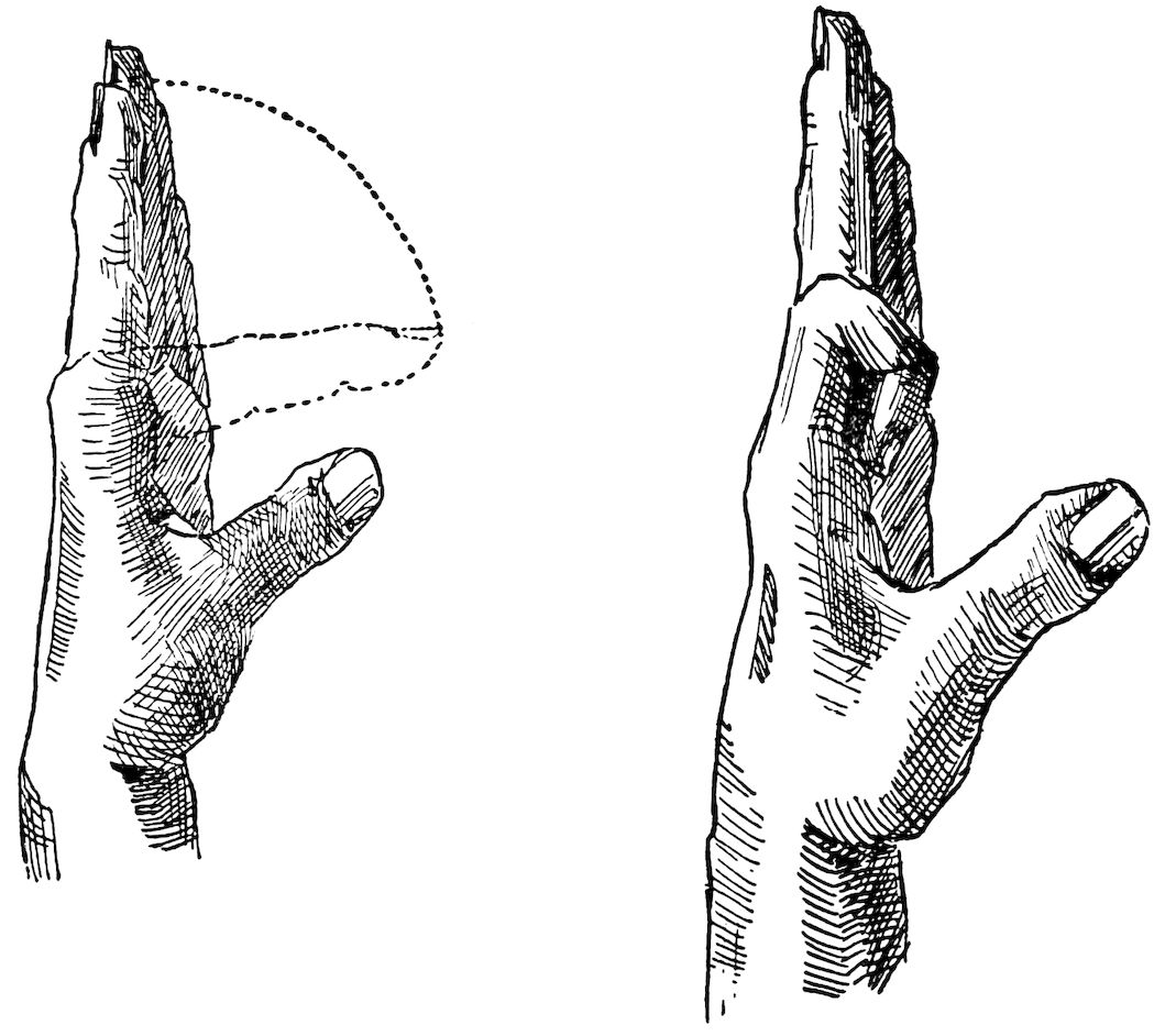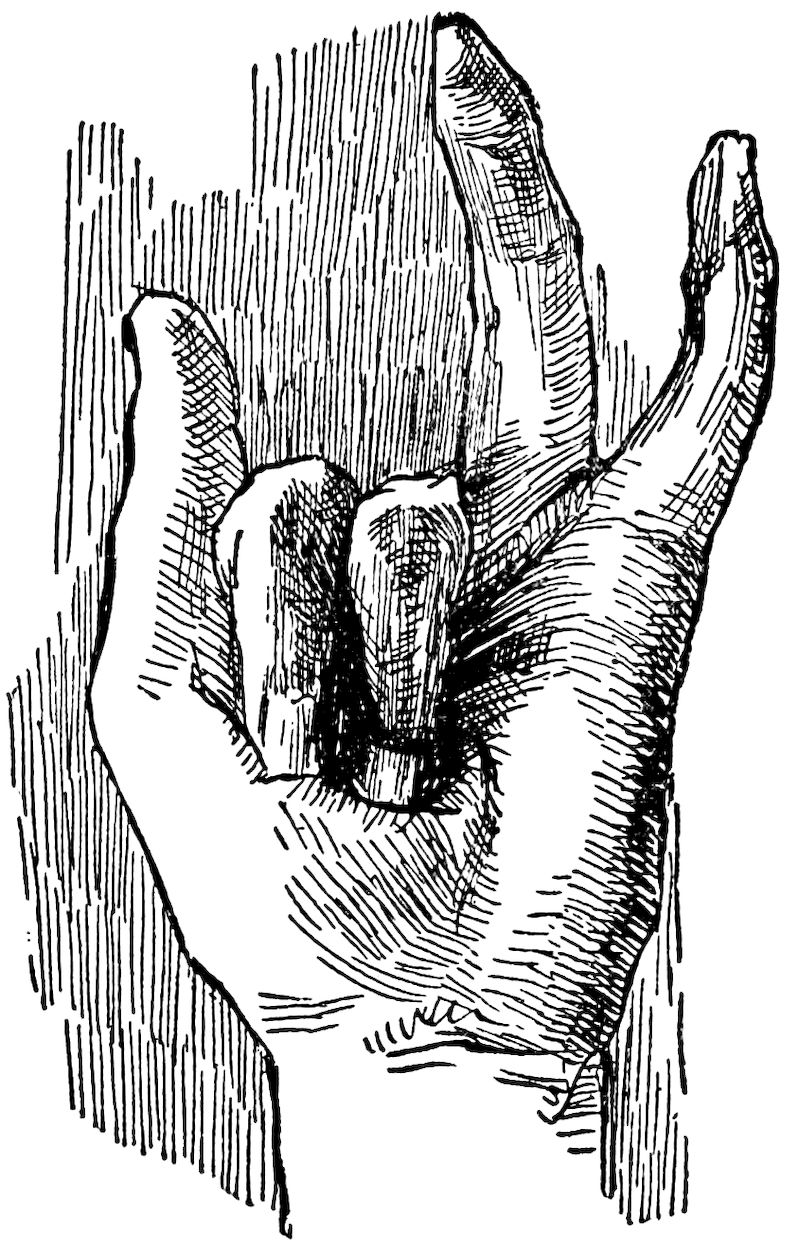 Open the left hand, thumb and fingers, all close together, turning the hand so that the thumb is towards your body and the little finger away from it. Bend the first finger at the knuckle joint, and nowhere else, and bring it down toward the palm of the hand until it is horizontal, that is at right angles to the plane of the palm and the other fingers. If it will not come down of itself, help it a little with the other hand, but be careful not to strain the left hand muscles when you are first starting this exercise. Try not to move the other fingers of the left hand while you are bending the index finger downward. Repeat this motion ten times.
