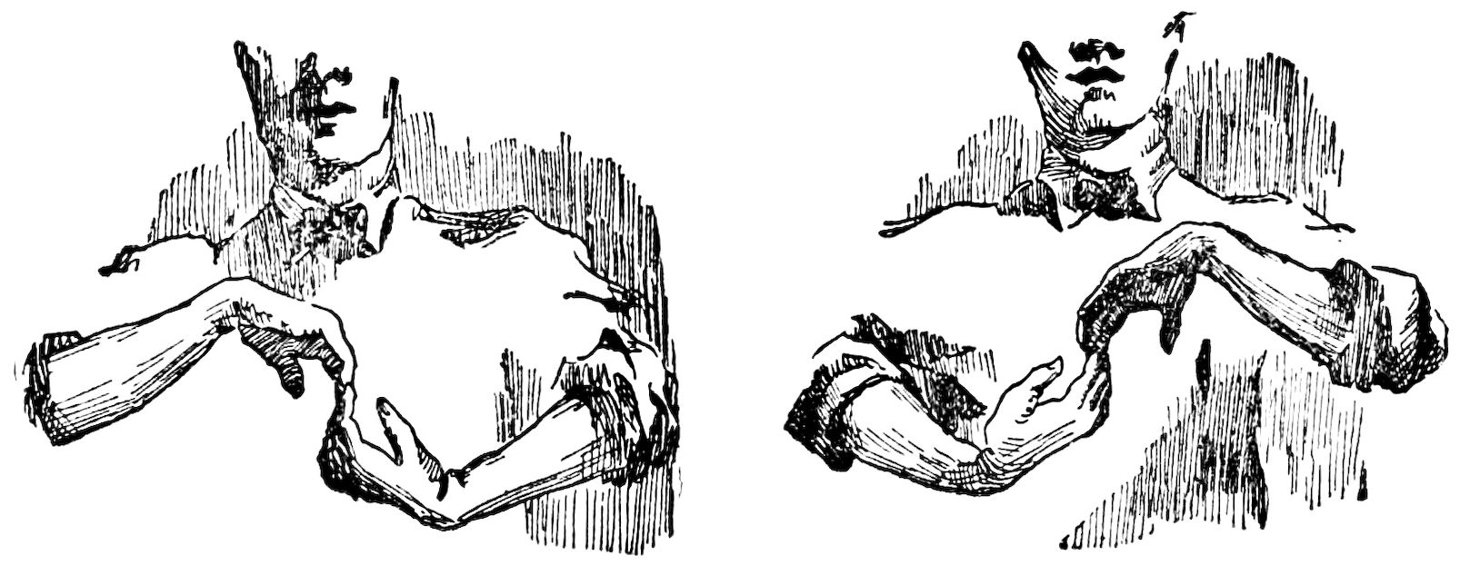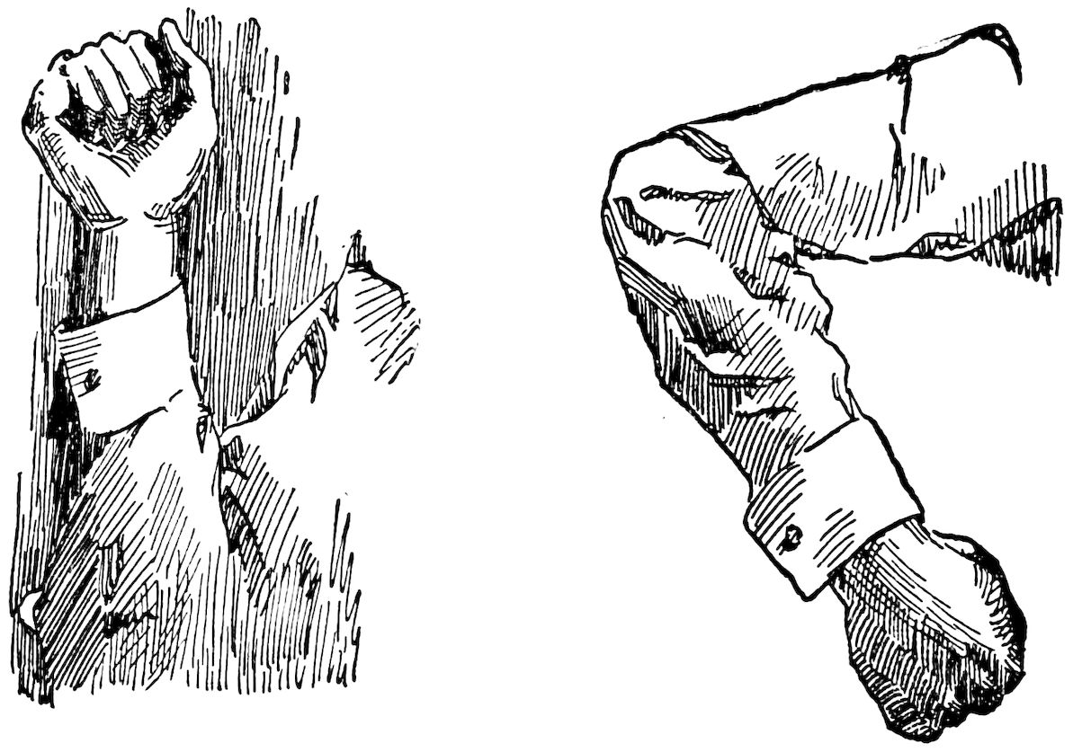 Hold your left arm across the chest palm up, but with the wrist bent as far down as possible, the fingers easily curled. Place the right arm in a similar position, but with the palm down, having the wrist of the right hand bent upward and fingers similarly curled. Lay the finger tips of the right hand on those of the left. From this position twist the forearms in opposite directions until the finger tips again come together, this time the palm of the right hand bent up, and of the left bent down.