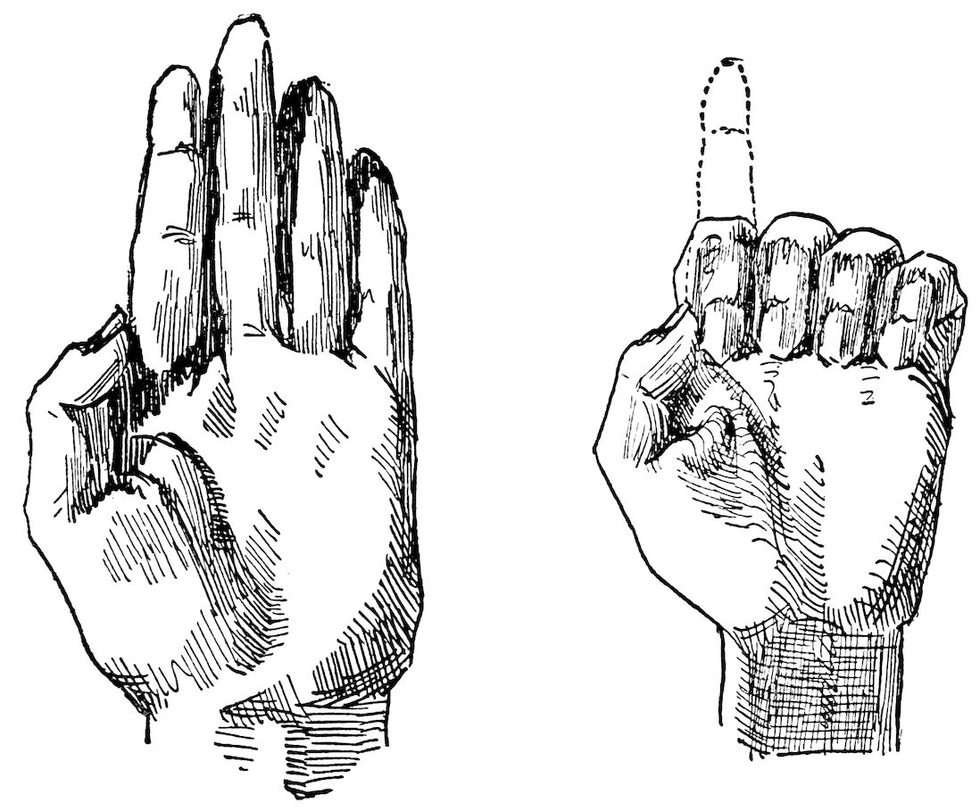 Extend the fingers of the left hand, with the little finger away from you and the thumb opened and pointing away from the palm, that is toward your right. Bring the index finger down until it is at right angles to the palm, bending only at the knuckle joint.