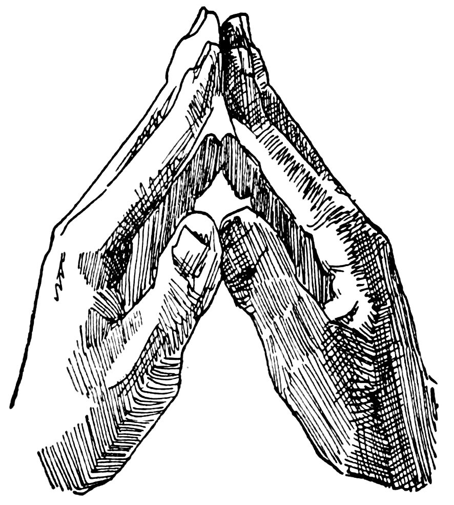 Extend both hands in front of you, palms together, the fingers of each hand held tightly against those of the other, the thumbs separated from the others and pointed toward you.