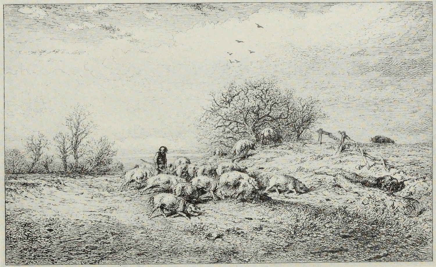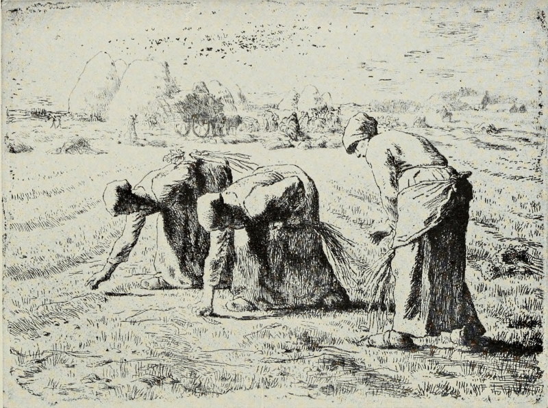 In Millet’s etchings the landscape and the figures are so inter-related as to make any separate study of them unavailing. They are models of significant draughtsmanship and profound feeling, in which nothing is introduced that does not bear directly upon the main theme. Shepherdess Knitting, Peasants Going to Work, Two Men Digging, and above all the Gleaners, have each their perfect setting. The wide-stretching plain, slightly undulating, shimmers in the hot summer sunshine, which bathes in a golden glow the three women gleaning, the harvesters gathering in the rich fruits of their toil, and the little village, snuggling amid its trees in the far distance to the right.