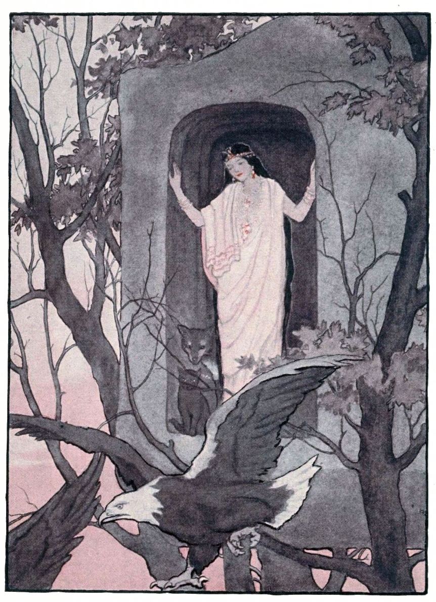 But while she stood there, afraid either to return or to go forward, she heard again a great beating of wings, and the eagle returned to her. She saw that he still had the urn, but now it was full of the dark and icy water for which she had been sent.