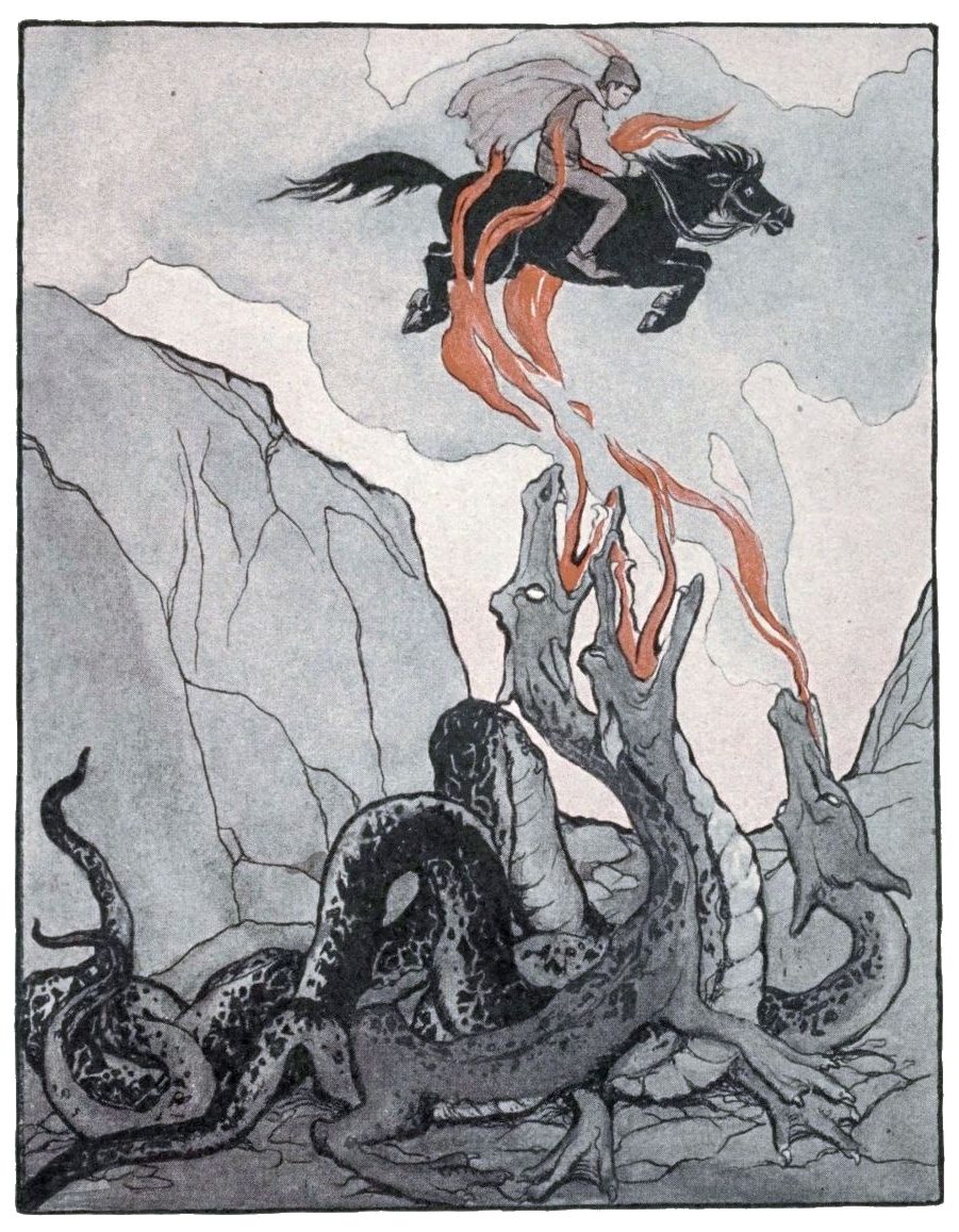From the old worlds across the seas come these fairy tales,—from Scotland and Scandinavia, from the Cossacks and the Russians and the Serbians, from Persia and India and Arabia and Bengal. There are stories of enchanted princes and bewitched princesses, of brave deeds and clever ones, of wonderful things like talking eggs and a magic pipe and a carpet that flew and a turban that made its wearer invisible. There are tales for boys, like that one of the brave lad who killed the “Stoorworm”; there are stories for girls, as that one about the wise girl who could guess the hardest riddle the King could ask. And there are stories about animals and birds for both boys and girls, such as “The Jackal and the Alligator” and the story of the beautiful black horse that befriended the widow’s son.