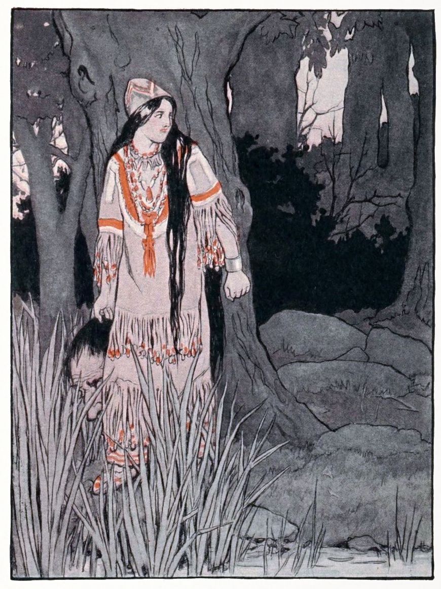 Surya Bai told her she came from a little house that had been built for her by a pair of eagles in a tree top far away. She told her the eagles were away from home, for they had gone to fetch her a diamond ring from far away and had left her with only a little dog and cat for companions. “And now the cat has put out the fire,” said she, “and I have no way to cook the food. We are very hungry, so give me, I beg of you, a little of your fire to carry home with me.”