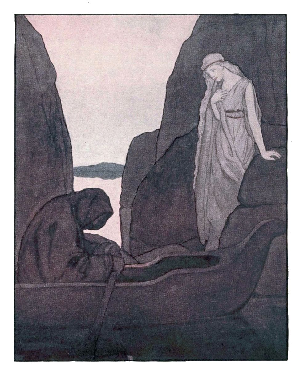 Soon she came to the river, and saw the boat lying there, and the dark boatman Charon. She stepped into the boat, and he took from her lips one of the pieces of silver. In silence he rowed her out upon the river.