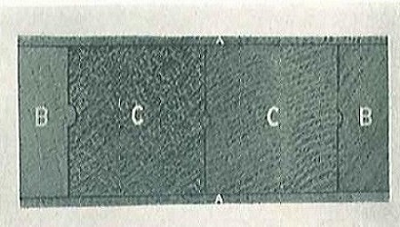 Curtis veneered doors have stiles and rails built-up as shown in the section above. “C” are blocks of California white pine which are tongued-and-grooved and glued together. They will not warp and they are light. “B” are strips of hardwood which form the edges of the stiles and rails and into which the molding is cut on Curtis ovolo-molded doors. “A” are strips of veneer which are secured to the white pine core by means of waterproof glue. Thus a door is produced with all the beauty of grain of hardwood, combined with the lightness, non-warping, non-checking characteristics of solid softwood doors.