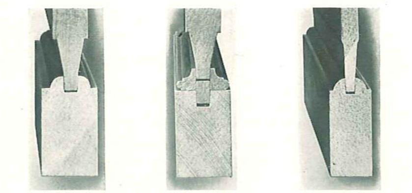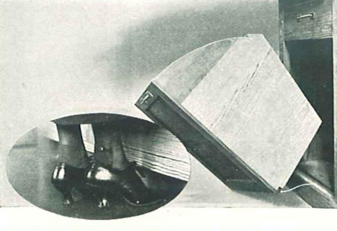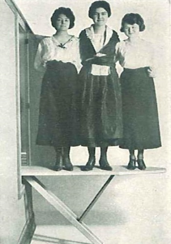 Ironing Board C-770. Above you see the construction of the Curtis built-in ironing board, which makes it adjustable in height. At the extreme left is the board in place; at the immediate left, the board in use; at the right the board is shown sustaining a weight of 365 pounds. The sturdy construction of the board and its leg makes a stable ironing board. The above construction is such that the board cannot shift endwise with the motion of the iron.