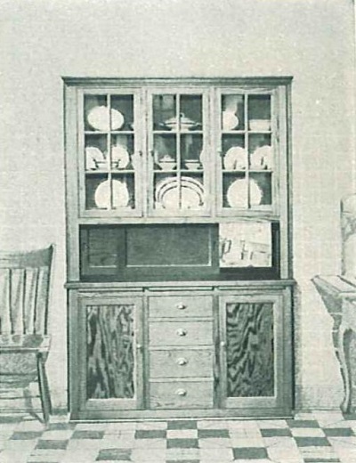 Hingeless, removable flour bins are used in Curtis kitchen dressers and worktables. They will not fall out. Beneath the front lower edge of worktables space is left for the toes of the person working at the table, enabling one to get up close without discomfort or scuffing the shoes.
