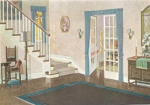First impressions of the interior are usually made by the hall. In the two-story house the stair may make or mar these first impressions. On account of its size, its utility, its construction as a part of the house, and its possibilities for beauty, the stairway is of both structural and architectural importance. Beauty depends not upon large-sized members, but upon graceful lines, good proportions and finely molded parts. In the entrance hall, French doors also add to the favorable impression which your home makes. They keep out sounds and drafts but do not shut out light between rooms.