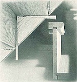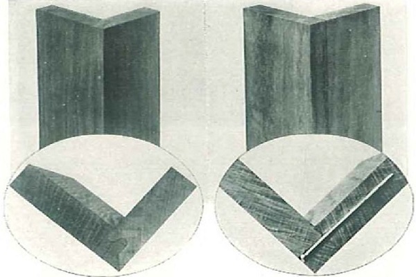In permanent furniture the tongue-and-groove mitred joint is used wherever practical. Note the differences between this construction and the common butt joint. With the former, no nails are used that mar the finished surface of the cabinet, and there is no incongruous contrast between edge and flat grain wood at the corners. Such a joint cannot open up as a result of humidity and temperature changes in the rooms.